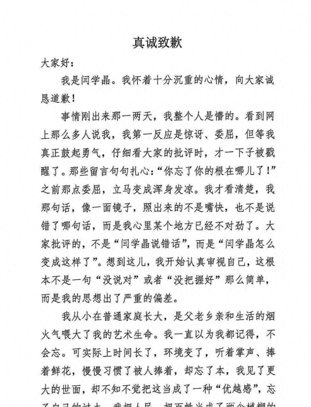 近日,演员闫学晶在直播中透露儿子拍一部戏“就挣几十万块钱”,需要负担家庭年开支百八十万,否则家庭无法运转。相关内容被部分网友解读为“哭穷”“脱离大众”,引发广泛讨论。演员闫学晶发文道歉:对不起我错了,思想出现严重偏差,习惯被人捧着却忘了本,见了大世面却把这当成优越感;此前因直播“哭穷”引争议近日,演员闫学晶在直播中透露儿子拍一部戏“就挣几十万块钱”,需要负担家庭年开支百八十万,否则家庭无法运转。相关内容被部分网友解读为“哭穷”“脱离大众”,引发广泛讨论。1月11日晚,闫学晶在朋友圈发文致歉,红星新闻记者从相关渠道获悉,这确实是闫学晶朋友圈所发。文中提到,“我是闫学晶。我怀着十分沉重的心情,向大家诚恳道歉!”“事情刚出来那一两天,我整个人是懵的。看到网上那么多人说我,我第一反应是惊讶、委屈,但等我真正鼓起勇气,仔细看大家的批评时,才一下子被戳醒了。”闫学晶称:大家批评的,不是“闫学晶说错话”,而是“闫学晶怎么变成这样了”。想到这儿,我开始认真审视自己,这根本不是一句“没说对”或者“没把握好”那么简单,而是我的思想出了严重的偏差。她提到:我从小在普通家庭长大,是父老乡亲和生活的烟火气喂大了我的艺术生命。我一直以为我都记得,不会忘。可实际上时间长了,环境变了,听着掌声、捧着鲜花,慢慢习惯了被人捧着,却忘了本,我见了更大的世面,却不知不觉把这当成了一种“优越感”,忘了自己的过去。以下为道歉全文: